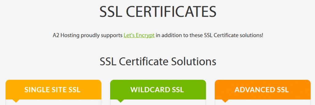 A2 Hosting has got you covered if your site doesn’t have an SSL Certificate! In fact, A2 Hosting offers free SSL Certificates! Looking for additional SSL options? A2 Hosting also offers affordable and easy to setup SSL options! Our wide range of SSL Certificate solutions include single-site SSL, WildCard SSL or Advanced SSL.